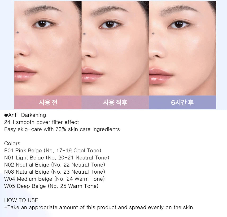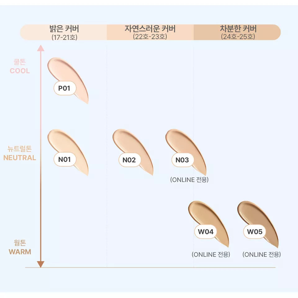 The 3CE Fitting Mesh Cushion N03 and W04 are shades of a foundation cushion that provides long-lasting, natural-looking coverage with a luminous, soft-matte finish. Enriched with 76% skincare ingredients like panthenol and hyaluronic acid, it also functions as an essence and primer, with SPF40 PA+++ protection. N03 is a beige shade for neutral undertones, fitting shade no. 23, while W04 is a medium beige for warm undertones, fitting shade no. 24.